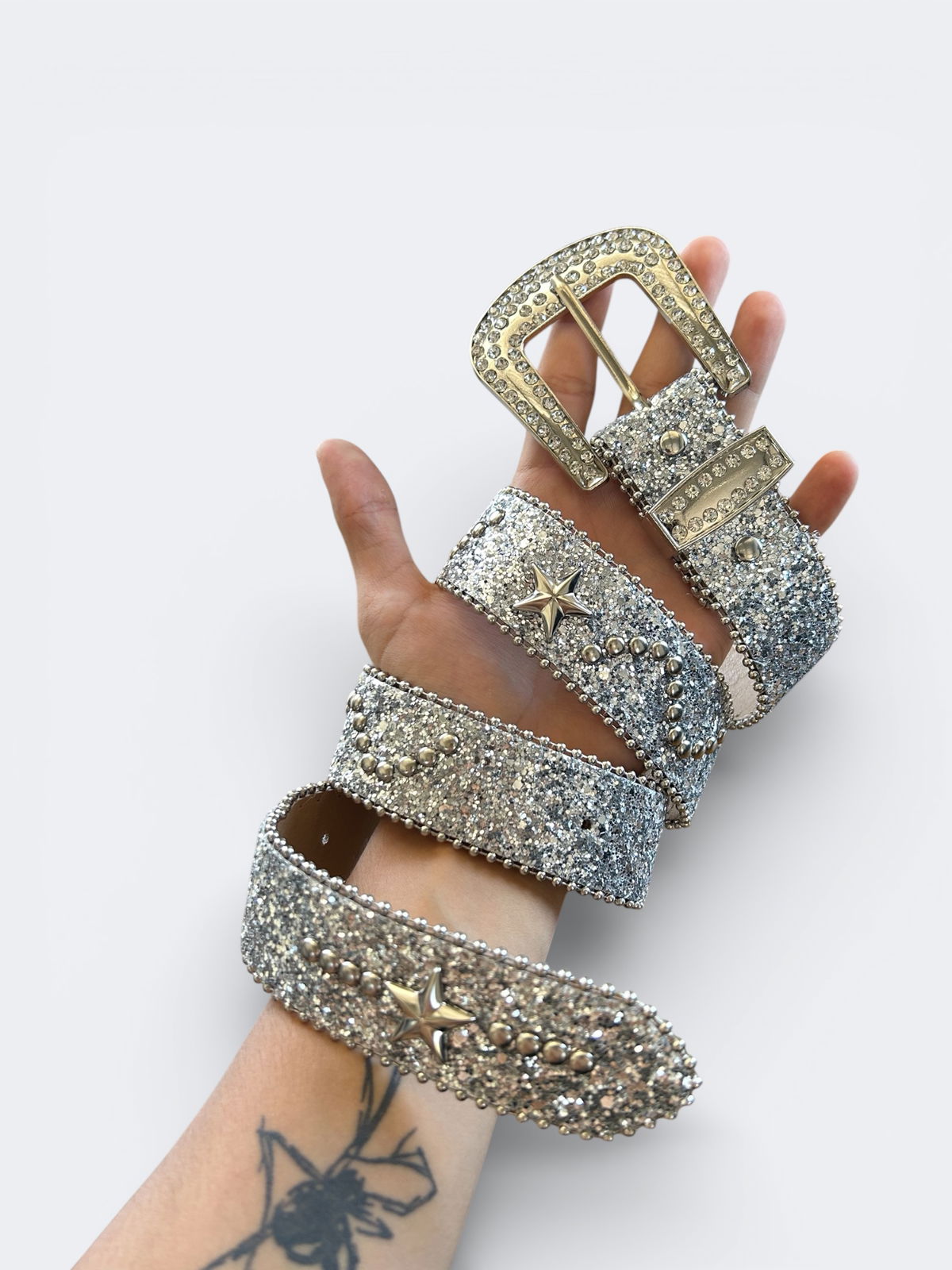 - Hebilla "Iced Out": Hebilla de gran tamaño con doble fila de cristales engastados.